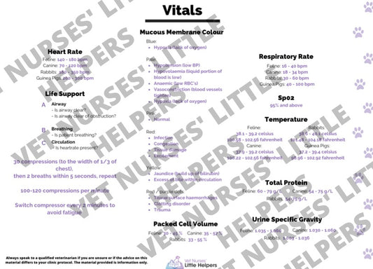This collection is designed to aid vet nurses and vets starting out in the industry, where you're still learning topics like vital signs and running pathology! They are designed to fit in your pocket as a referral tool, to pull out whenever you're a little stuck and need a hand!